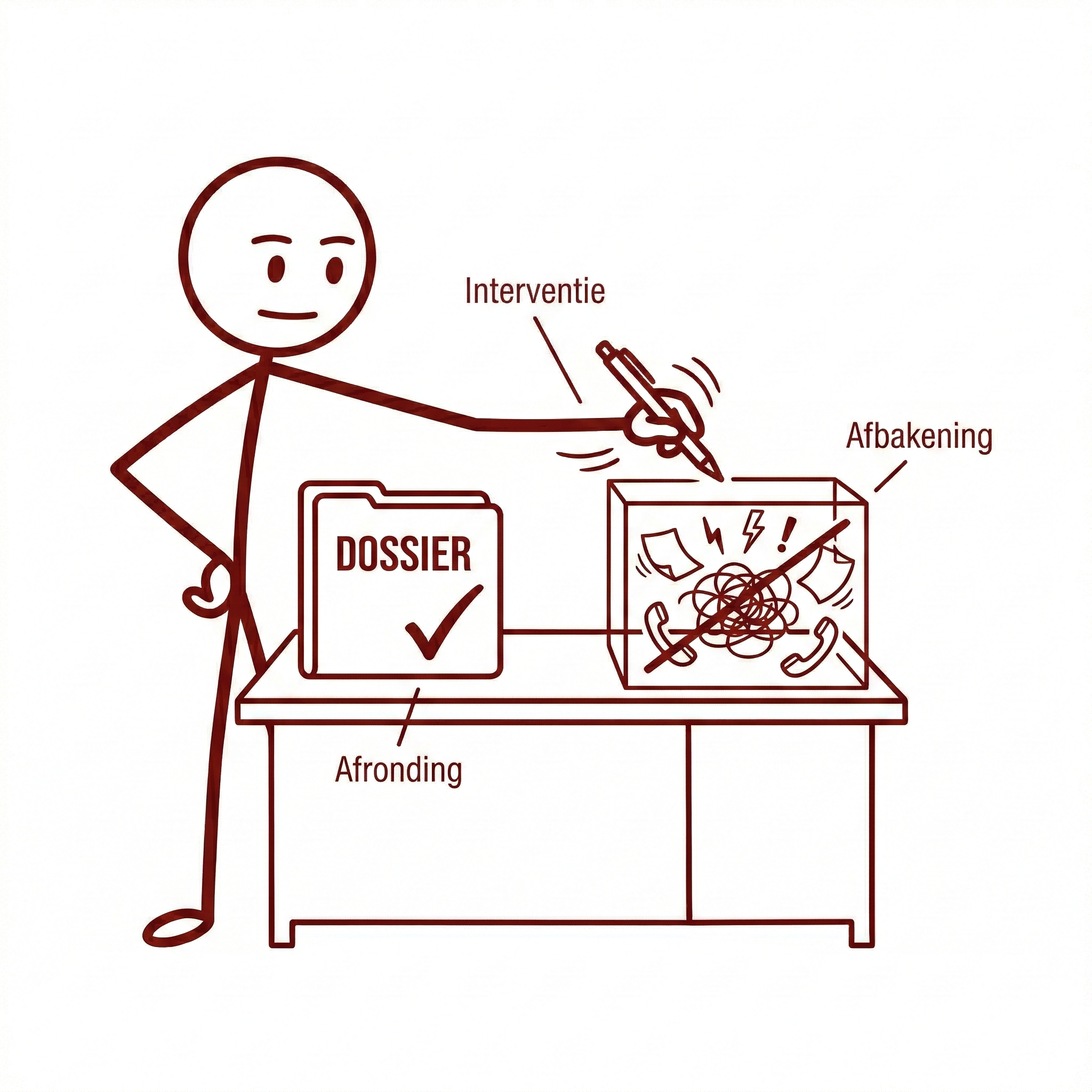 de tijdelijke overname van één vastgelopen dossier tot het is afgerond.